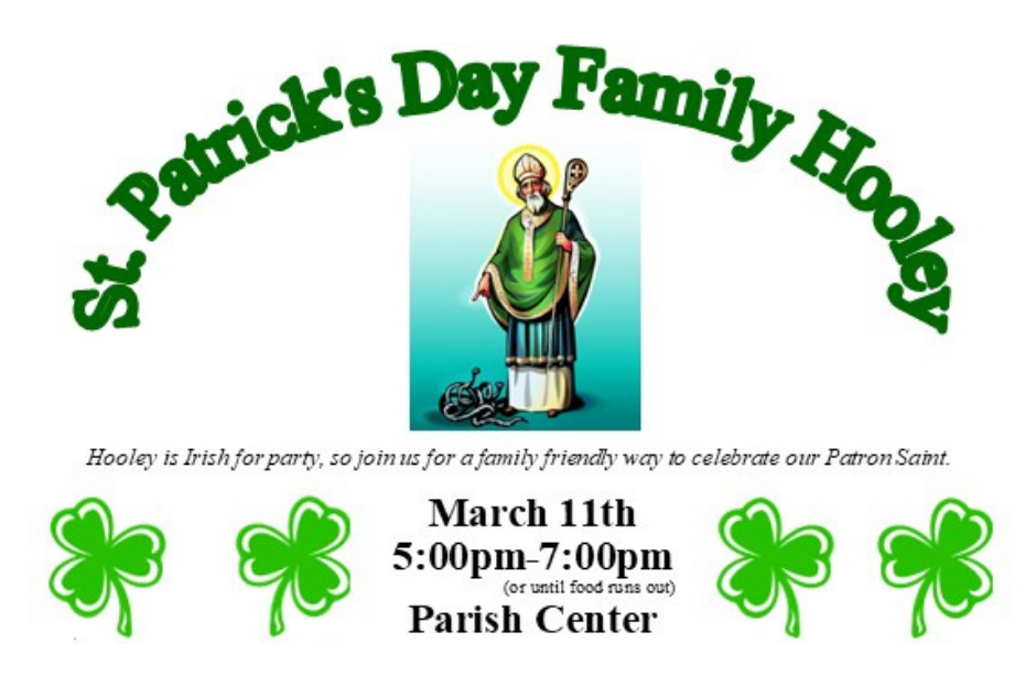 Our St. Patrick’s Day Family Hooley (Irish for party) is Wednesday, March 11 from 5 PM to 7 PM in the Parish Center. Our Irish Person of the Year will also be announced at the event.